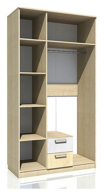 Главное отделение шкафа оборудовано штангой для вешалок и антресольной полкой, а сбоку стеллаж с четырьмя вместительными полками. Внизу расположено два выдвижных ящика на роликовых направляющих.