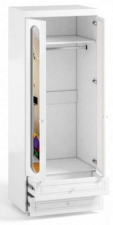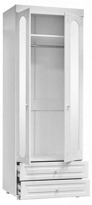 Шкаф платяной с зеркалами и ящиками Афина АФ-50 белое дерево - вместительная, комбинированная система хранения для спальни или прихожей. Модель оснащается 2 зеркальными распашными дверцами. Внутри 2 полки и горизонтальная штанга для вешалок с одеждой. Внизу 2 широких выдвижных ящика для хранения.