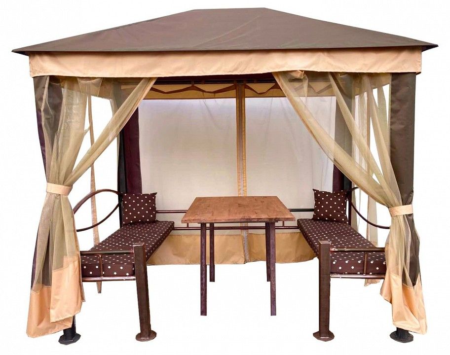 лавочки- 2 шт единая конструкция шатра, сиденье сварная сетка - 1500x500x80 мм, толщина мягкого элемента - 80 мм, наполнитель мягкого элемента hollcon-forplit, стол- металл окрашенный, дерево пропитка 1200x800x800 мм, защита от осадков и ветра - крыша Oxford 420D, защита от насекомых - пологи из специальной сетки