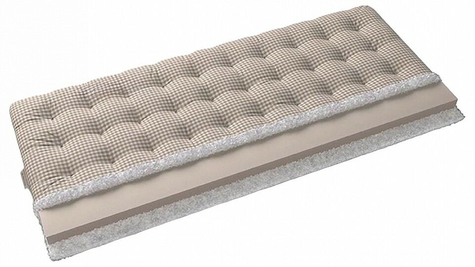 состав слоев:, фирменная ткань (50% натурального хлопка), хлопковое волокно Сotton fiber - 20 мм, пенополиуретан - 60 мм, хлопковое волокно Сotton fiber - 20 мм, нагрузку на спальное место - до 100 кг