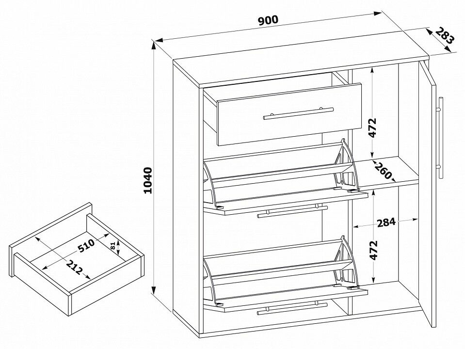1 ящик, 3 дверцы, 3 полки