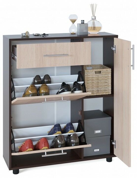Вместительная тумба для обуви оборудована выдвижным ящиком, двумя отсеками для обуви и полками за дверцей. Конструкцией предусмотрены регулируемые опоры высотой 44 мм. Диапазон регулировки составляет 20 мм. Изделие поставляется в разобранном виде. Хорошо упаковано в гофротару вместе с необходимой фурнитурой для сборки и подробной инструкцией. Рекомендуем сохранить инструкцию по сборке (паспорт изделия) до истечения гарантийного срока.