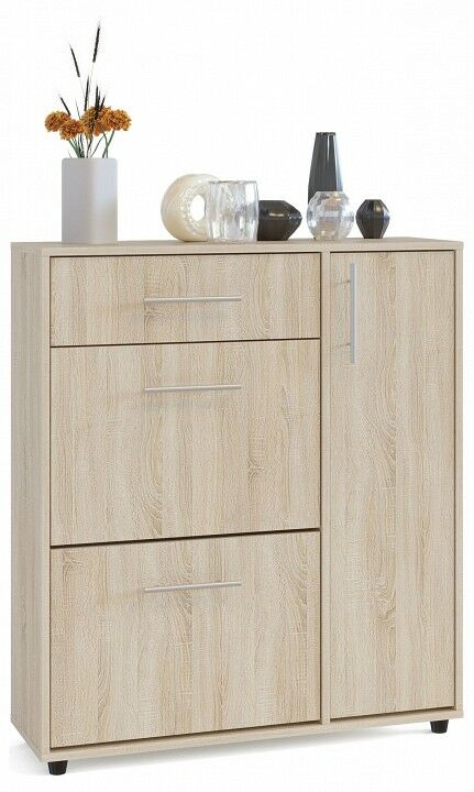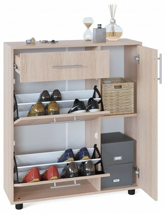 Вместительная тумба для обуви оборудована выдвижным ящиком, двумя отсеками для обуви и полками за дверцей. Конструкцией предусмотрены регулируемые опоры высотой 44 мм. Диапазон регулировки составляет 20 мм. Изделие поставляется в разобранном виде. Хорошо упаковано в гофротару вместе с необходимой фурнитурой для сборки и подробной инструкцией. Рекомендуем сохранить инструкцию по сборке (паспорт изделия) до истечения гарантийного срока.