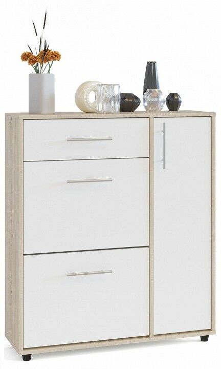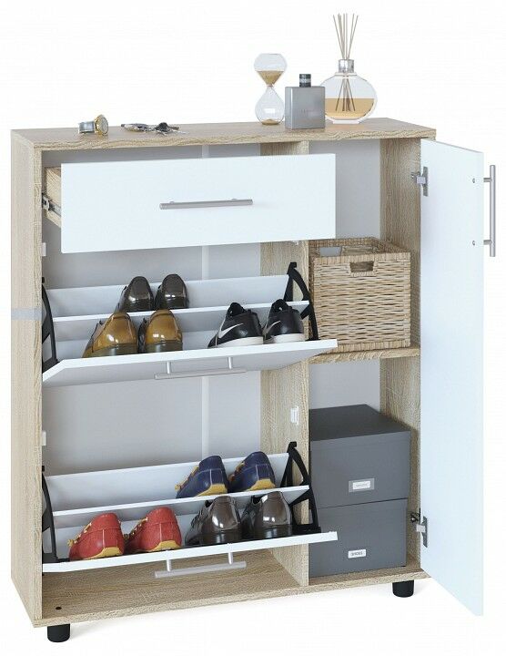 Вместительная тумба для обуви оборудована выдвижным ящиком, двумя отсеками для обуви и полками за дверцей. Конструкцией предусмотрены регулируемые опоры высотой 44 мм. Диапазон регулировки составляет 20 мм. Изделие поставляется в разобранном виде. Хорошо упаковано в гофротару вместе с необходимой фурнитурой для сборки и подробной инструкцией. Рекомендуем сохранить инструкцию по сборке (паспорт изделия) до истечения гарантийного срока.