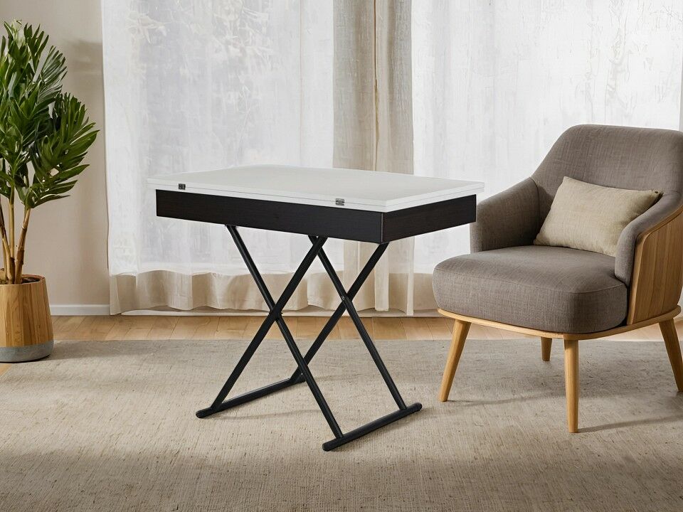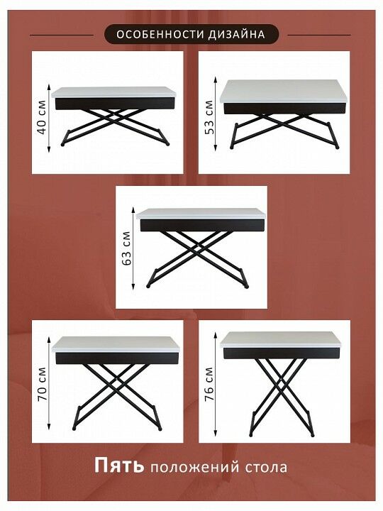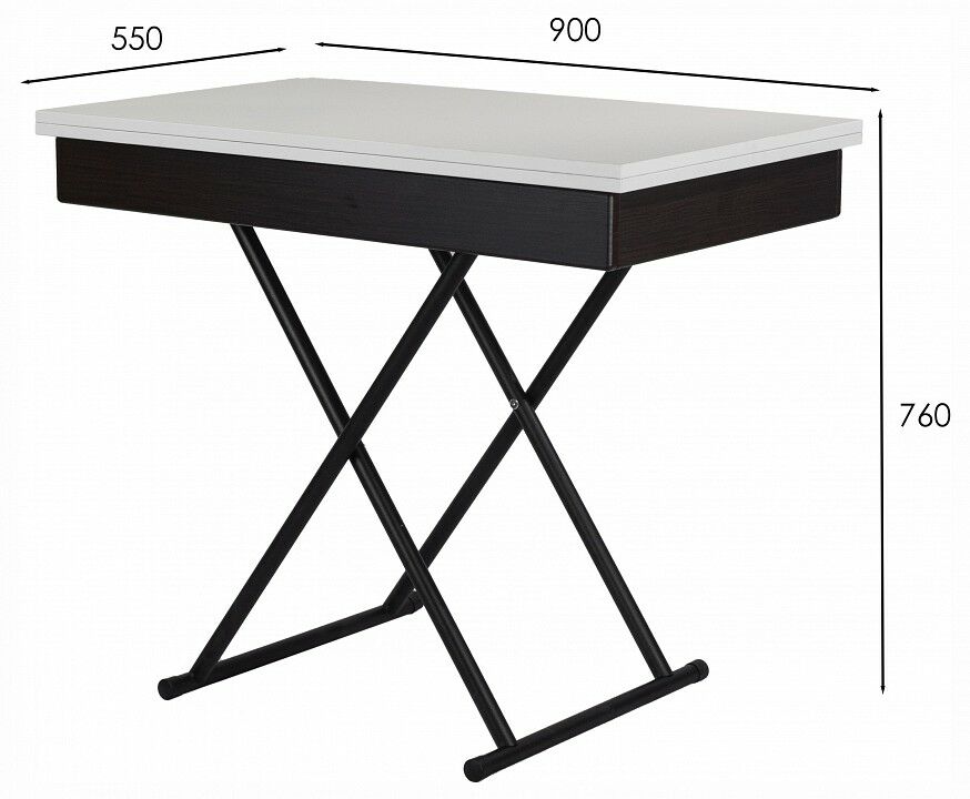 Стол-трансформер Лерон - это инновационное решение для вашего интерьера. Столешница из ЛДСП толщиной 16 мм и каркас из металлических трубок диаметром 25 мм обеспечивают прочность и долговечность. Возможность трансформирования позволяет использовать его как обеденный, журнальный, сервировочный или даже как прикроватный столик. По высоте столик имеет пять положений: 400 мм, 530 мм, 630 мм, 700 мм, 760 мм. Раскладывающаяся столешница - это находка для тех, кто любит принимать гостей или просто хочет иметь больше пространства для творчества и работы. В сложенном виде она имеет размеры 550х900 мм, в разложенном 1100х900 мм. Лерон позволяет с комфортом разместить до 6 человек, а также оптимизировать пространство и повысить комфорт вашего дома.