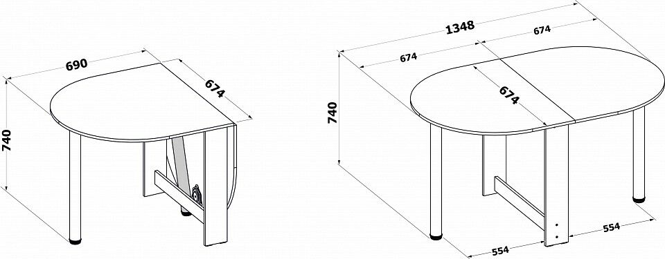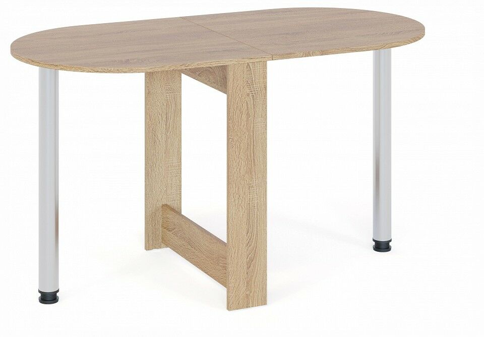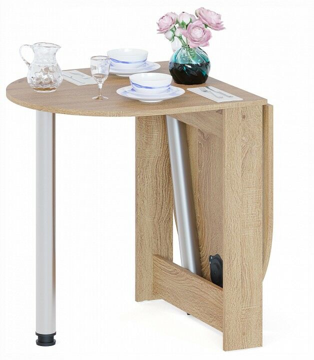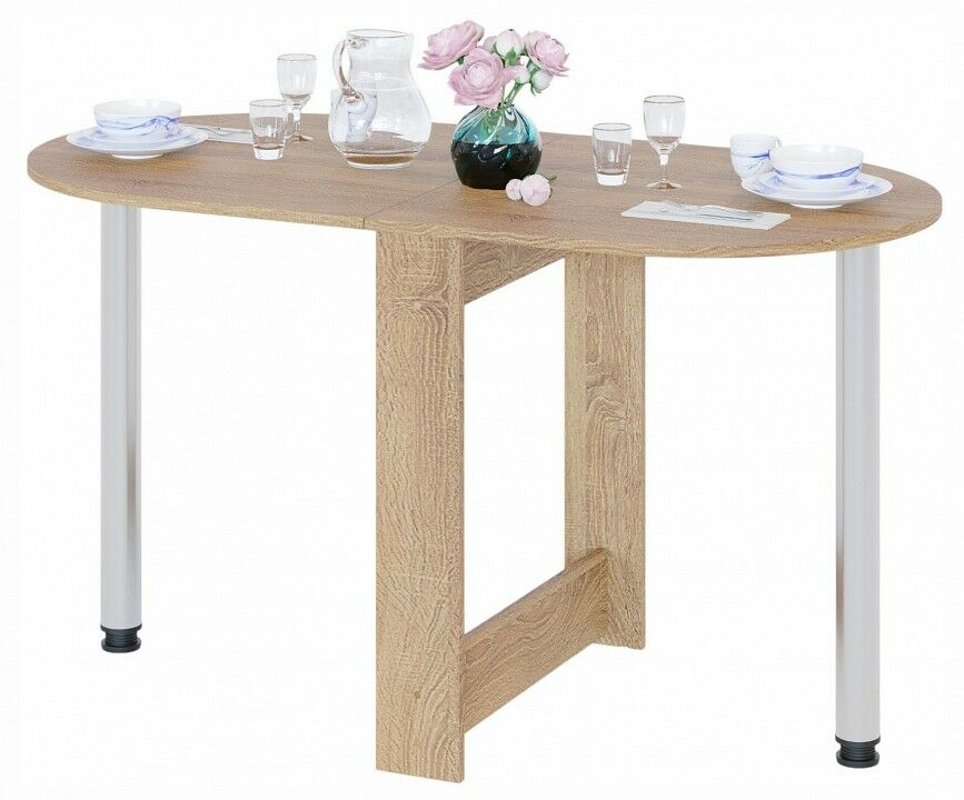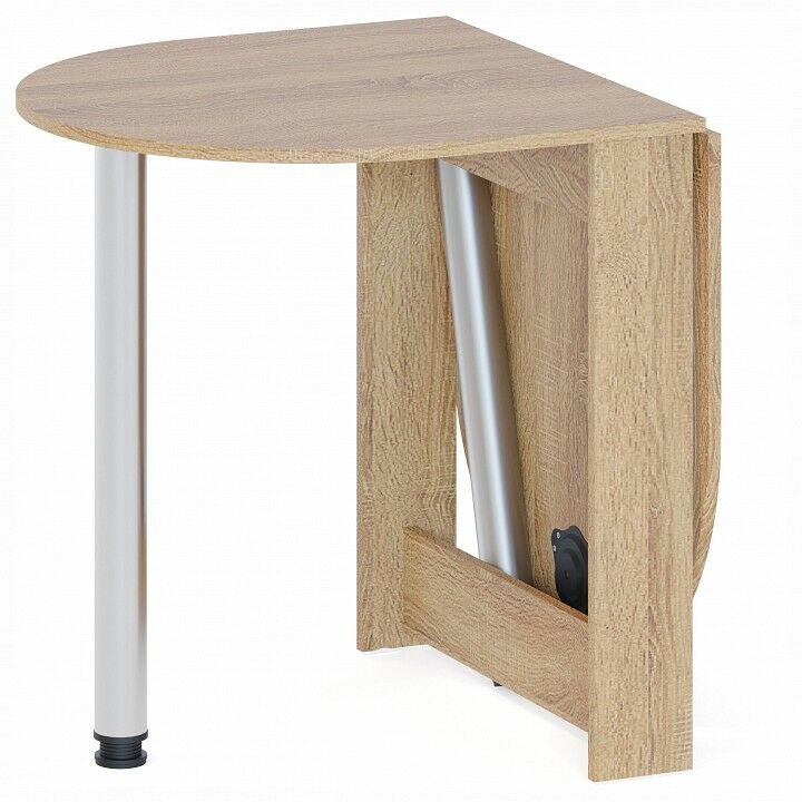Стол-книжка СП-18 прекрасно дополнит интерьер небольшой кухни или гостиной, благодаря своей функциональности и компактным размерам. Модель в сложенном виде поможет организовать комфортное место для приема пищи или работы за ноутбуком, при этом ножка хранится в специальной нише в основании стола. При необходимости изделие быстро и без усилий можно разложить до полноценного обеденного стола, подняв одну половину столешницы и прикрутив к ней ножку. Хромированные опоры с возможностью регулировки по высоте обеспечивают надежность и устойчивость конструкции, а скругленные углы и овальная форма рабочей поверхности исключают травмоопасность. Ширина столешницы в разложенном состоянии — 1348 мм, в сложенном — 690 мм. Обращаем внимание! У стола опускается только одна половина и его нельзя сложить в узкую тумбу. Материал: ЛДСП 16 мм, кромка ПВХ 0,4 мм. Материал опор: металл. Максимальная нагрузка: 20 кг.