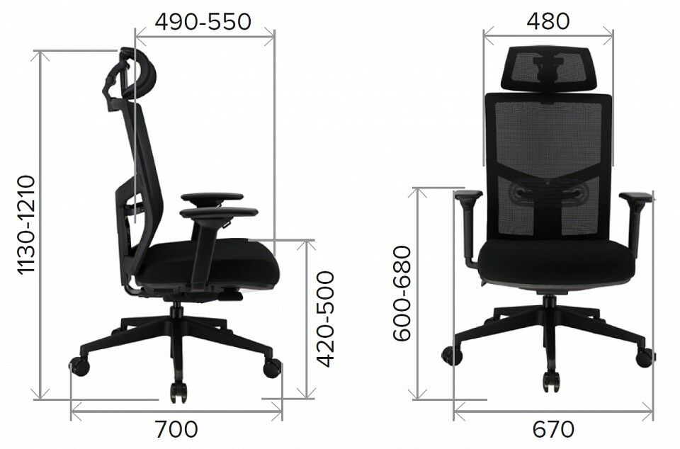 высота сиденья - 420-500 мм, ширина сиденья - 480 мм, глубина сиденья - 490-550 мм