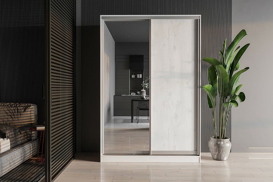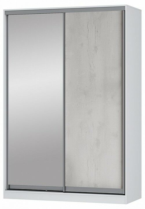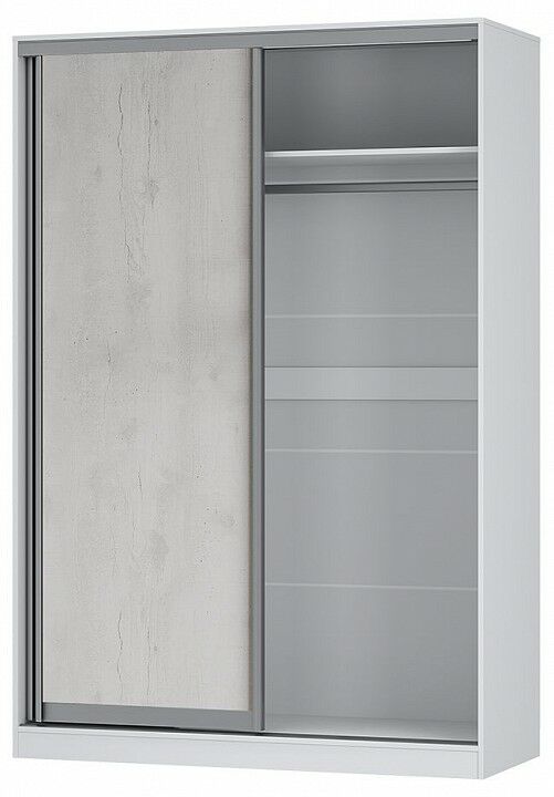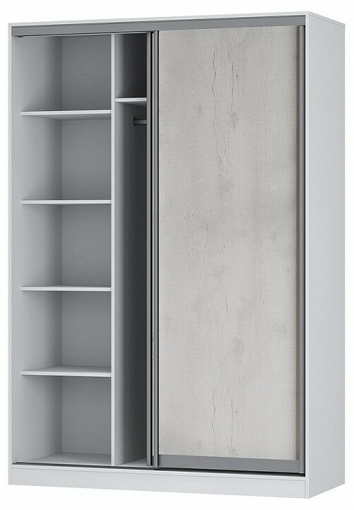 Шкаф-купе Мадрид в цвете Бетон Пайн. Одна из створок полностью декорирована зеркалом с еврокромкой. Внутри вы найдете отсек с пятью полками для хранения вещей и белья, с другой стороны вместительную зону с хромированной штангой для одежды на вешалках.