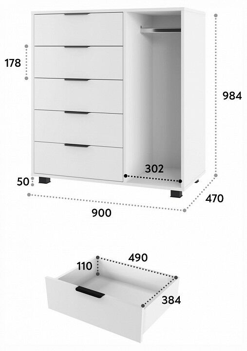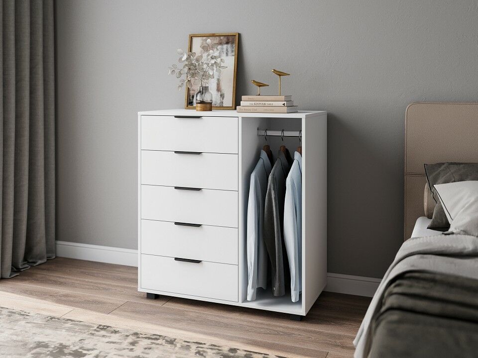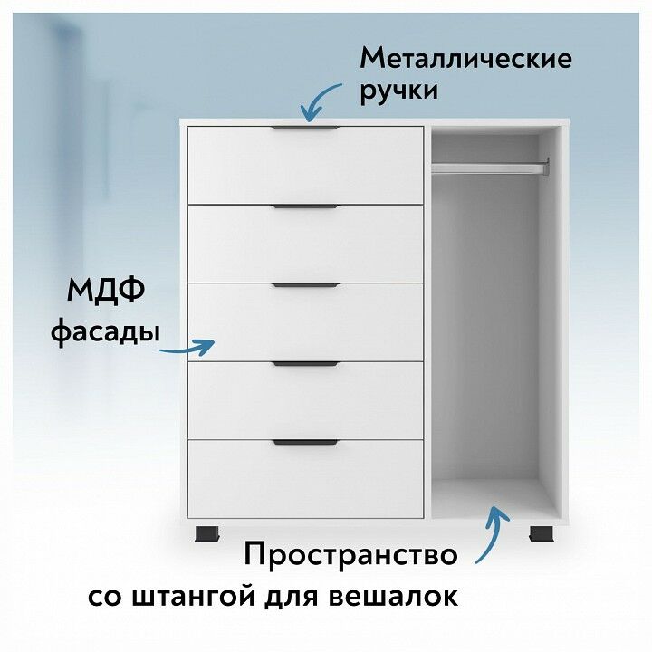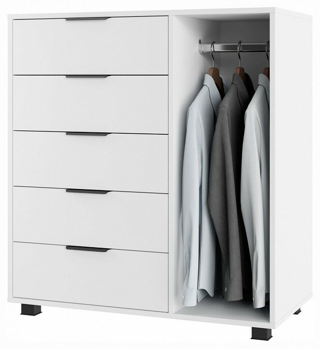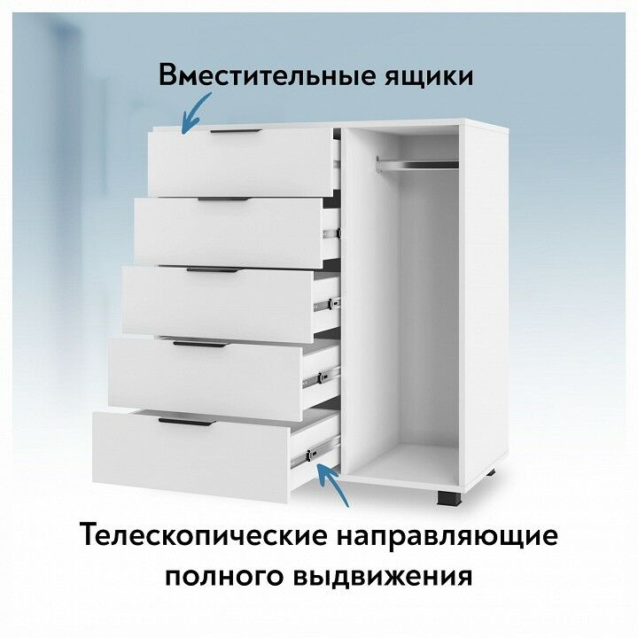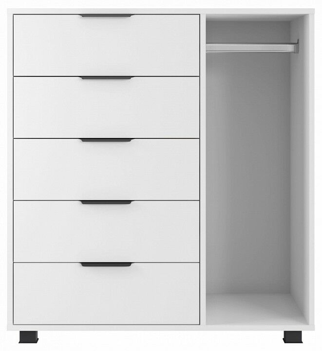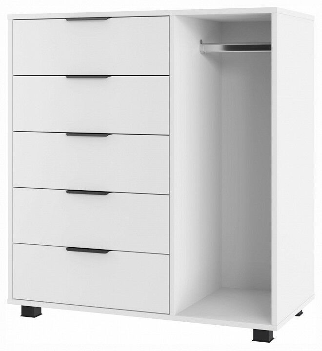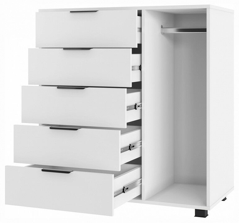 Тумба комбинированная К-20 отлично дополнит место для хранения в спальне и гостиной. Комод оснащен 5-ю выдвижными ящиками и штангой для пиджаков и рубашек. , Фурнитура: телескопические направляющие полного выдвижения без доводчиков, 5 вместительных ящиков, защитный бортик от падения вещей, металлические ручки, фасады ящиков МДФ, пространство со штангой для вешалок.