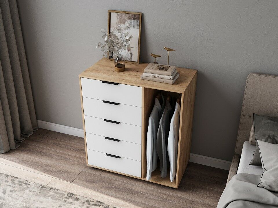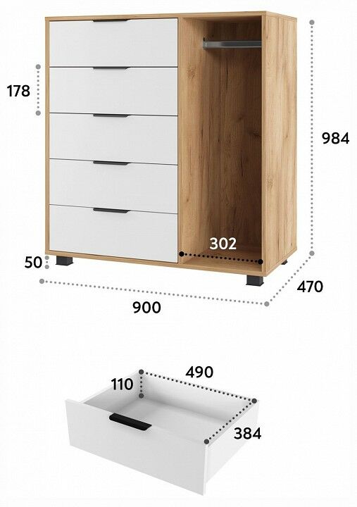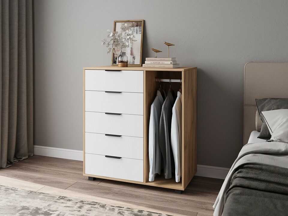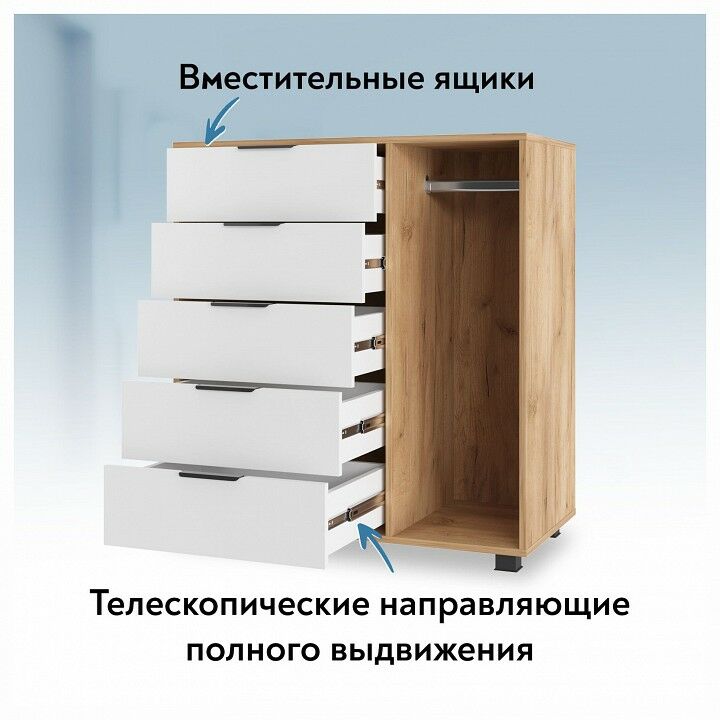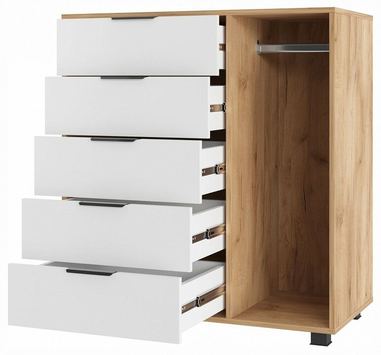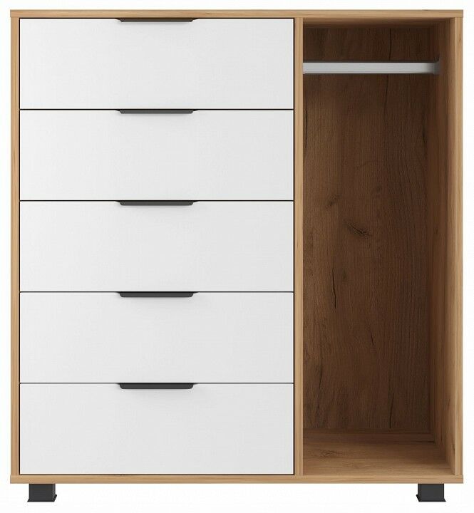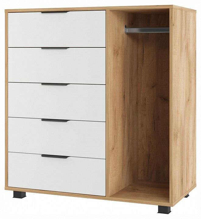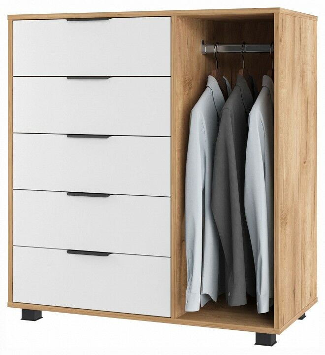 Тумба комбинированная К-20 отлично дополнит место для хранения в спальне и гостиной. Комод оснащен 5-ю выдвижными ящиками и штангой для пиджаков и рубашек. , Фурнитура: телескопические направляющие полного выдвижения без доводчиков, 5 вместительных ящиков, защитный бортик от падения вещей, металлические ручки, фасады ящиков МДФ, пространство со штангой для вешалок.