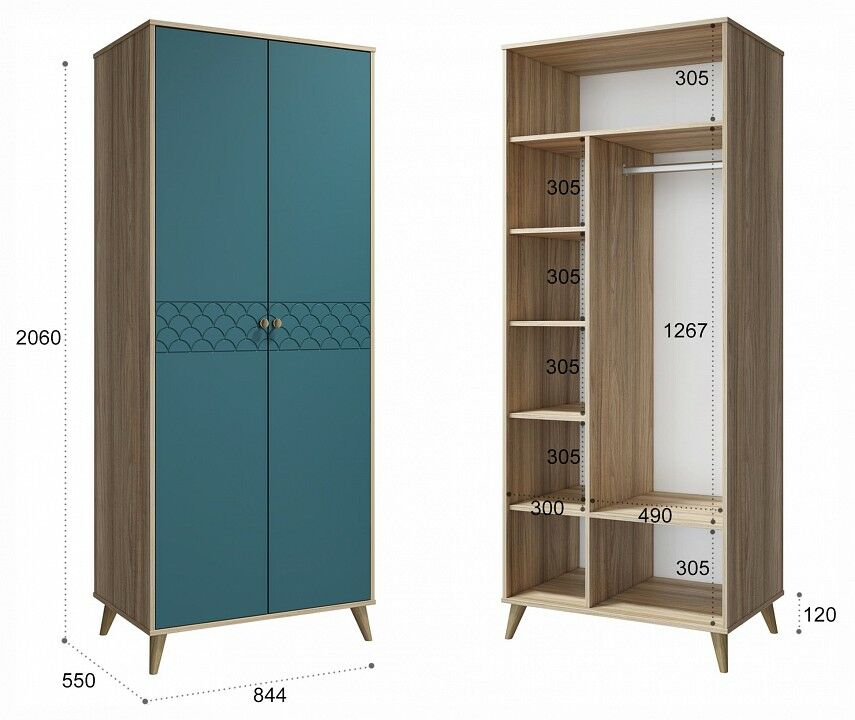1 штанга для вешалок, 2 дверцы, 6 полок