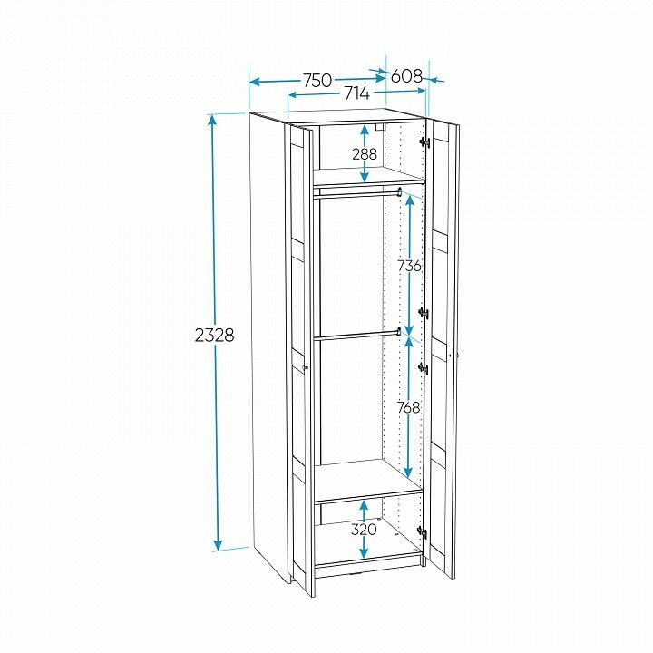 1 штанга для вешалок, 2 дверцы, 2 полки