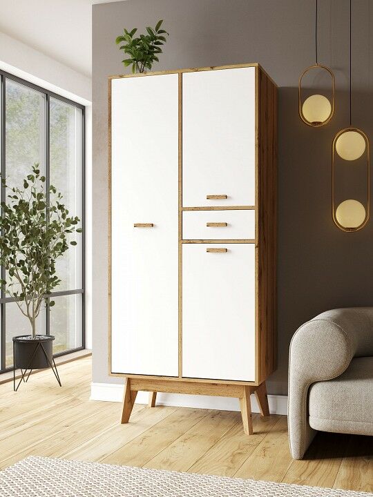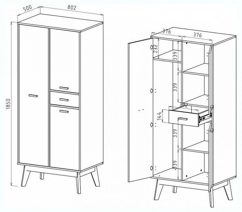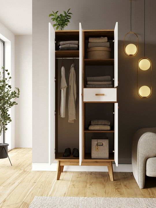 1 штанга для вешалок, 1 ящик, 3 дверцы, 3 полки