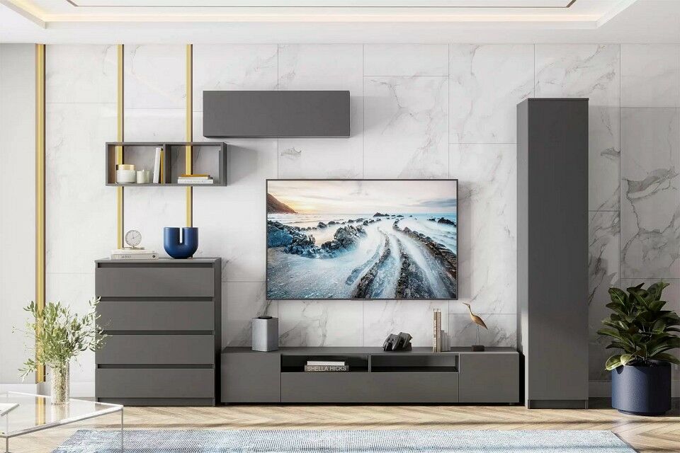 Модульная гостиная Денвер в современном стиле в цвете графит серый - это идеальное решение для тех, кто хочет создать стильный и функциональный интерьер. Она сочетает в себе простоту и элегантность, а также предлагает множество вариантов компоновки. Благодаря модульной системе, вы можете выбрать именно те элементы, которые подходят для вашего помещения. Кроме того, графит серый цвет создает атмосферу спокойствия и уюта, что особенно важно для гостиной. В состав модульной гостиной Денвер могут входить различные элементы:, Шкафы. Они могут быть с распашными или раздвижными дверцами. В зависимости от потребностей, можно выбрать шкаф для одежды, книжный шкаф или пенал., Тумба под телевизор. Она оснащена откидной дверкой, внутри перегородка и полки для хранения различных вещей., Комоды. Это классический элемент мебели, который может использоваться для хранения одежды и белья.