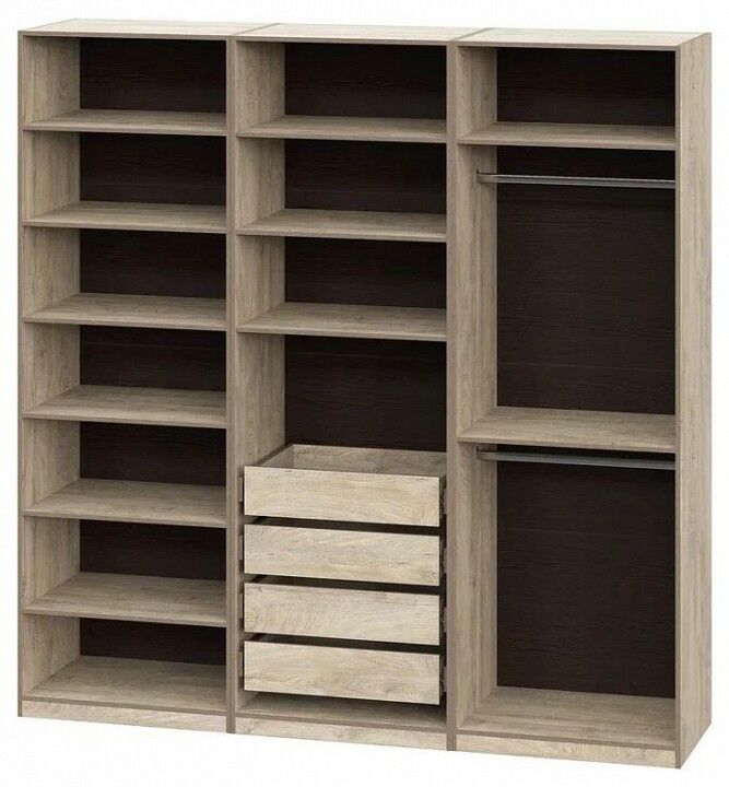 2 штанги для вешалок, 3 шкафа - 750х554х2300 мм, 4 ящика - 718х524х160 мм, 11 полок - 718х554х16 мм