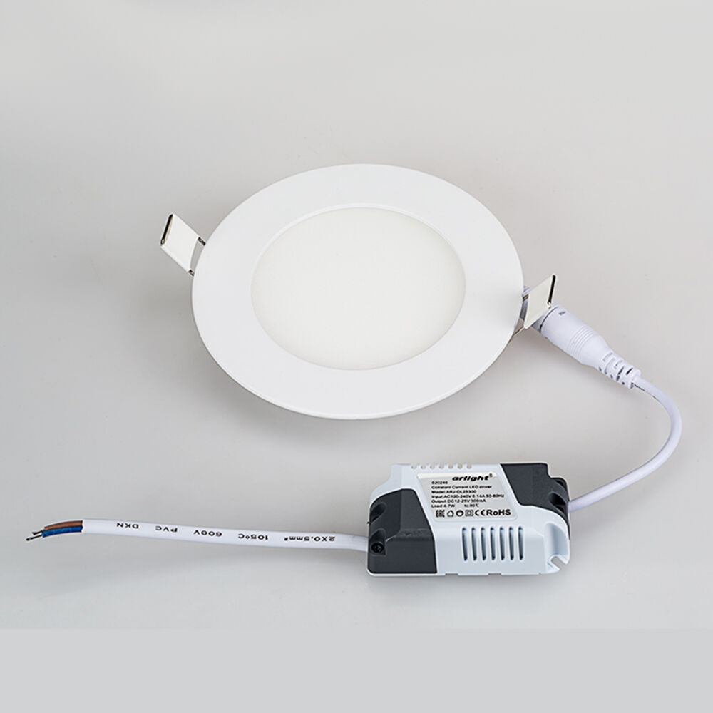 Встраиваемая круглая тонкая панель. Мощность 6 Вт, св. поток 428 лм, 69 лм/Вт, дневной 4000 K, CRI>80, угол 115°, напряжение питания 230 В. Белый круглый корпус из алюминия, экран PMMA+PS, степень защиты IP44. Размер: диаметр 120 мм, высота 18 мм. Монтаж встраиваемый, установочное отверстие: диаметр 110 мм. Драйвер 12-24 В, 300 мА, пульсация <1%.